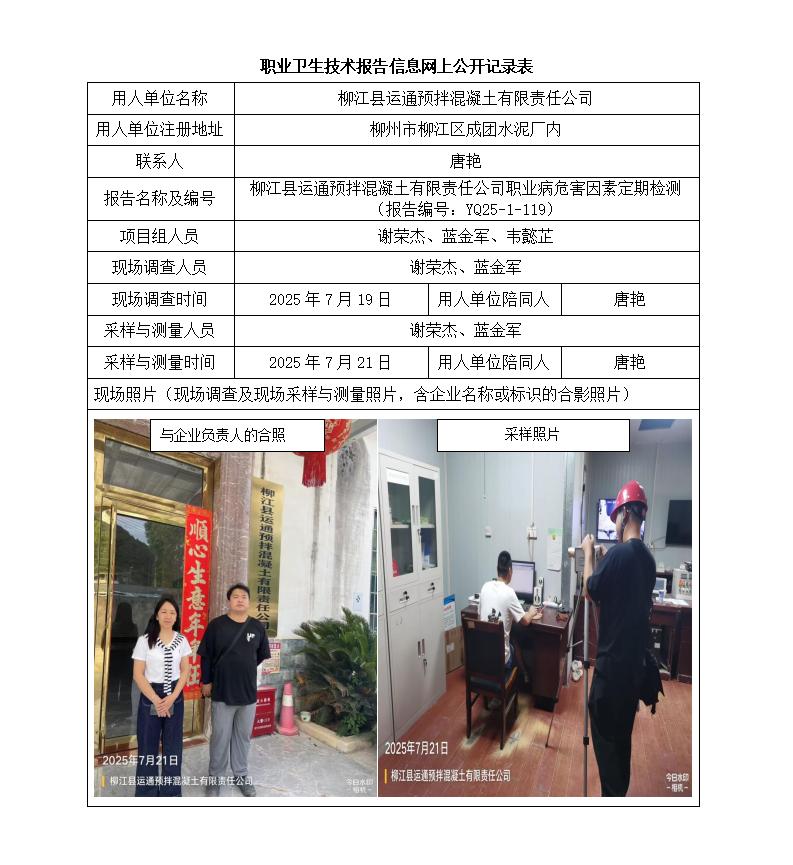 柳江縣運(yùn)通預(yù)拌混凝土有限責(zé)任公司職業(yè)病危害因素定期檢測(cè)
