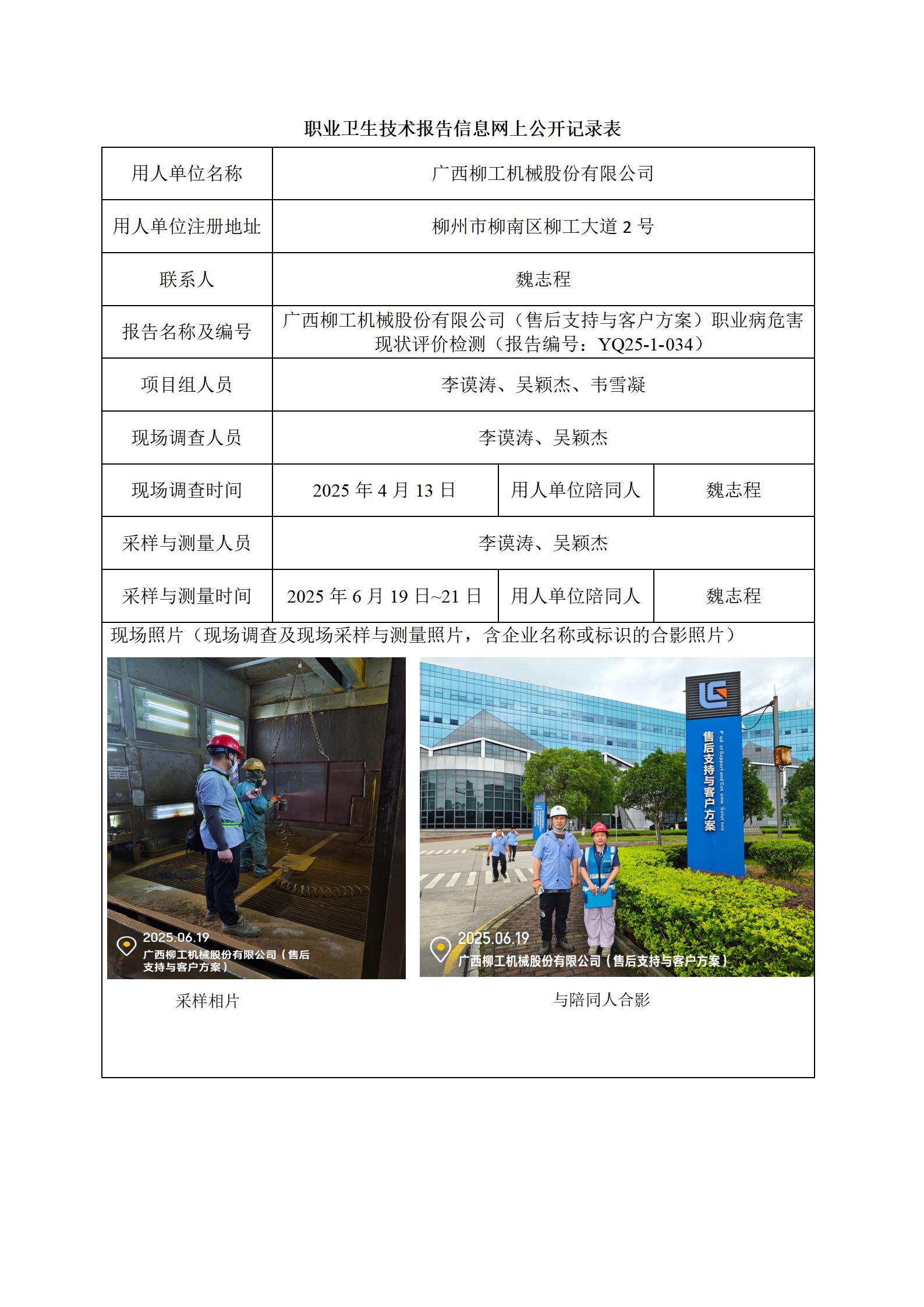 廣西柳工機械股份有限公司(售后支持與客戶方案)職業(yè)衛(wèi)生技術報告信息網(wǎng)上公開記錄表